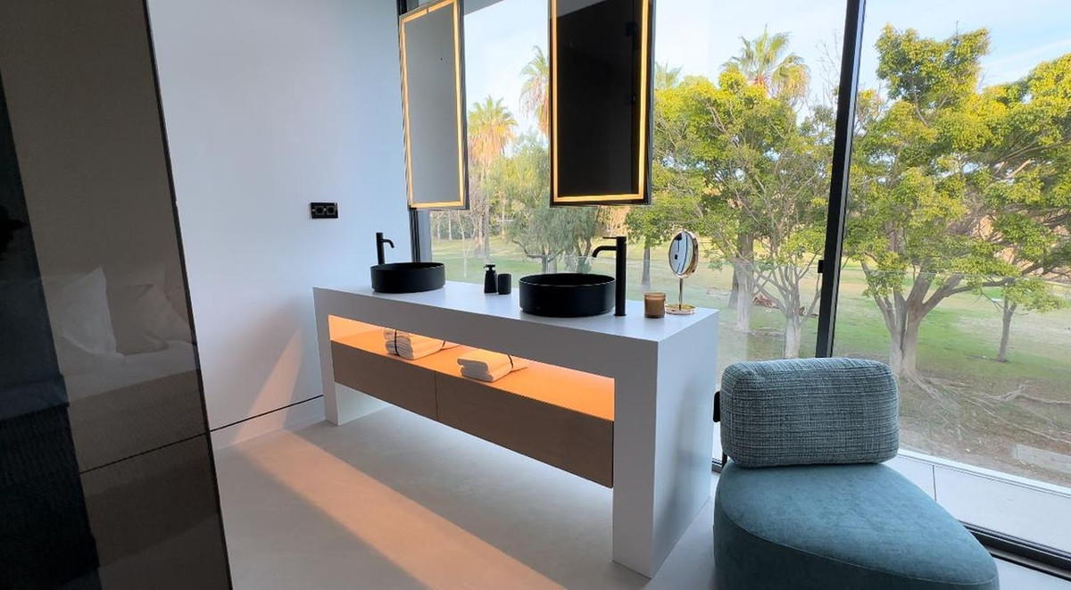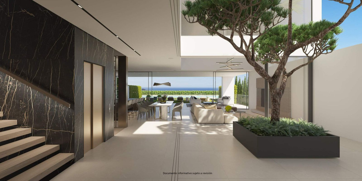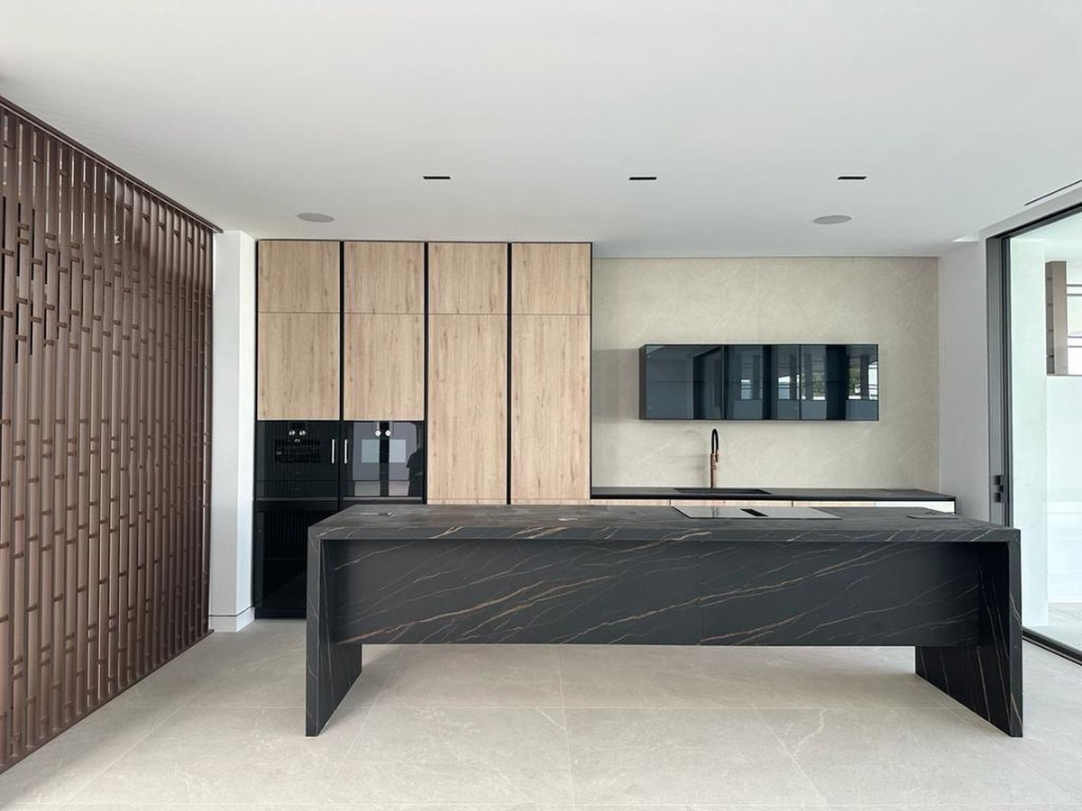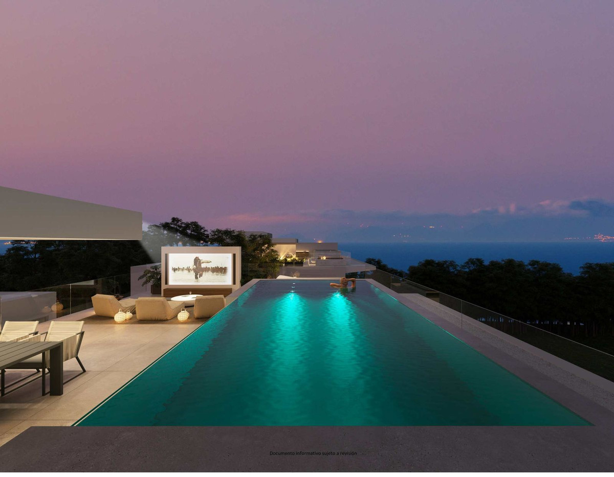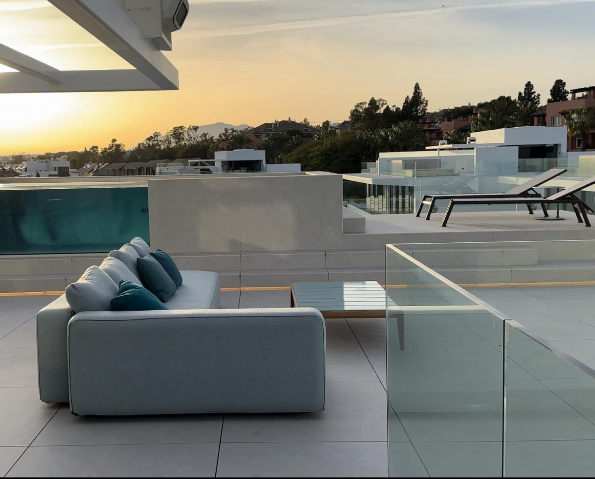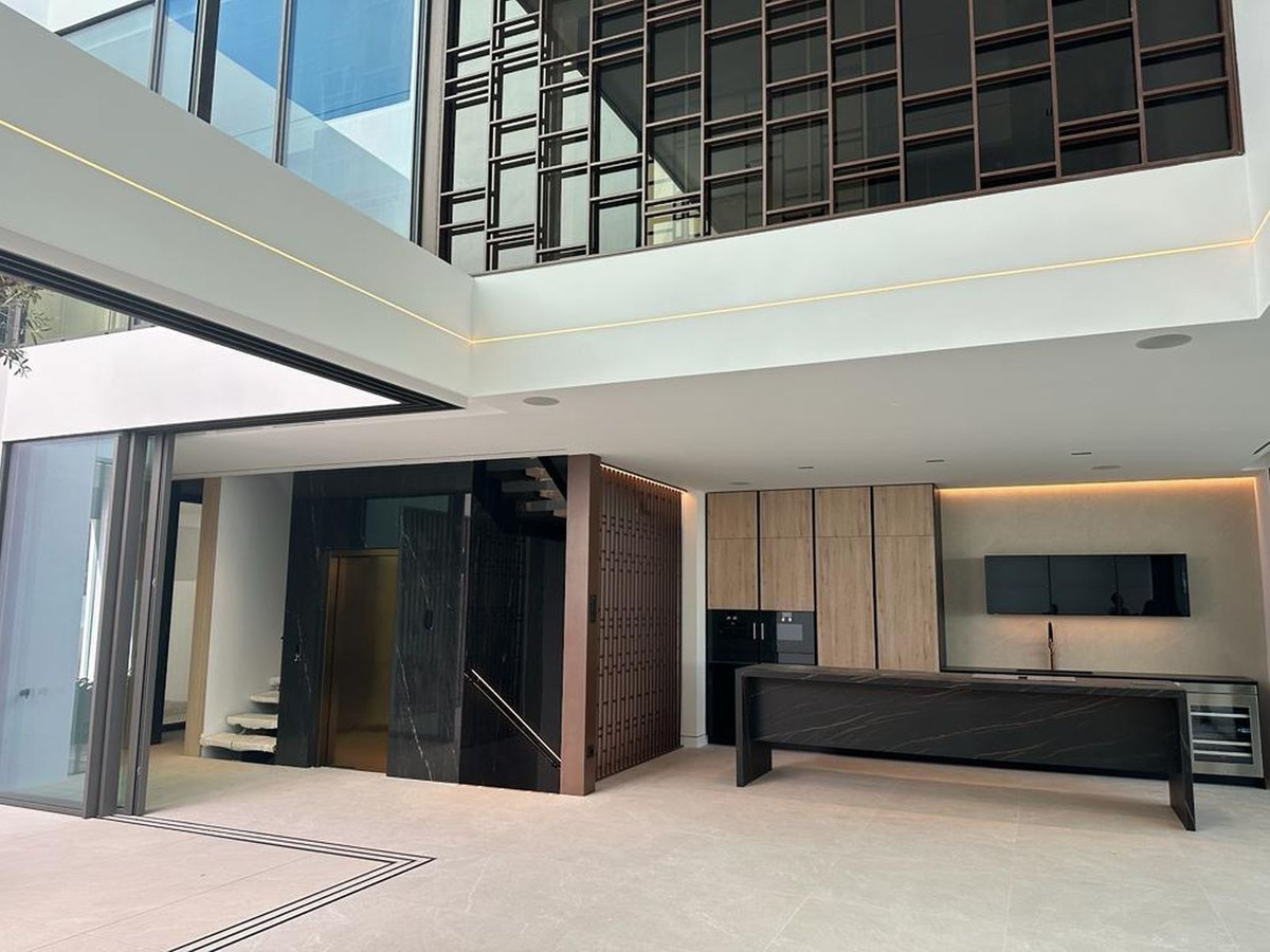 This magnificent Viila is located in a gated and secured residence of 12 Villas on the luxurious Marbella Golden Mile. It is ideal for those who seek comfort and luxury of one of the most prestigious areas of the entire Mediterranean region. Villa was built in 2023. The beautifully built Villa on 4 levels offers high quality, stylish and bright living room open to the large and elegant terrace with stunning panoramic views towards the sea. All 2 bedroom suites include floor-to-ceiling windows, oak flooring, Porcelanosa marble and hardware throughout, showcasing an elegant and refined modern style. A sleek minimalist kitchen has integrated Gaggenau appliances. All 4 levels are connected by a modern elevator. Terraces leading out to a private area of garden – as well as having access to the beautifully landscaped communal gardens and swimming pool. Roof terrace with private swimming pool and outdoor cinema. A customizable basement provides ample space for an additional third bedroom, a home gym or room for any other use, such as an office. Underground parking for 4 cars. It is facing south-west, admires spectacular views of the Mediterranean Sea, Puerto Banus marina and has the legendary La Concha Mountain as a background. Surrounded with high-end properties of the Golden Mile, this perfectly executed contemporary property is just 250 meters away from the sandy beach and an array of amenities, well-known restaurants and bars, 5-star iconic hotels like Puente Romano, designer boutiques, shops and supermarkets. Unique opportunity to own a contemporary villa – one of just 12 – with panoramic sea views set on the world-famous Golden Mile!