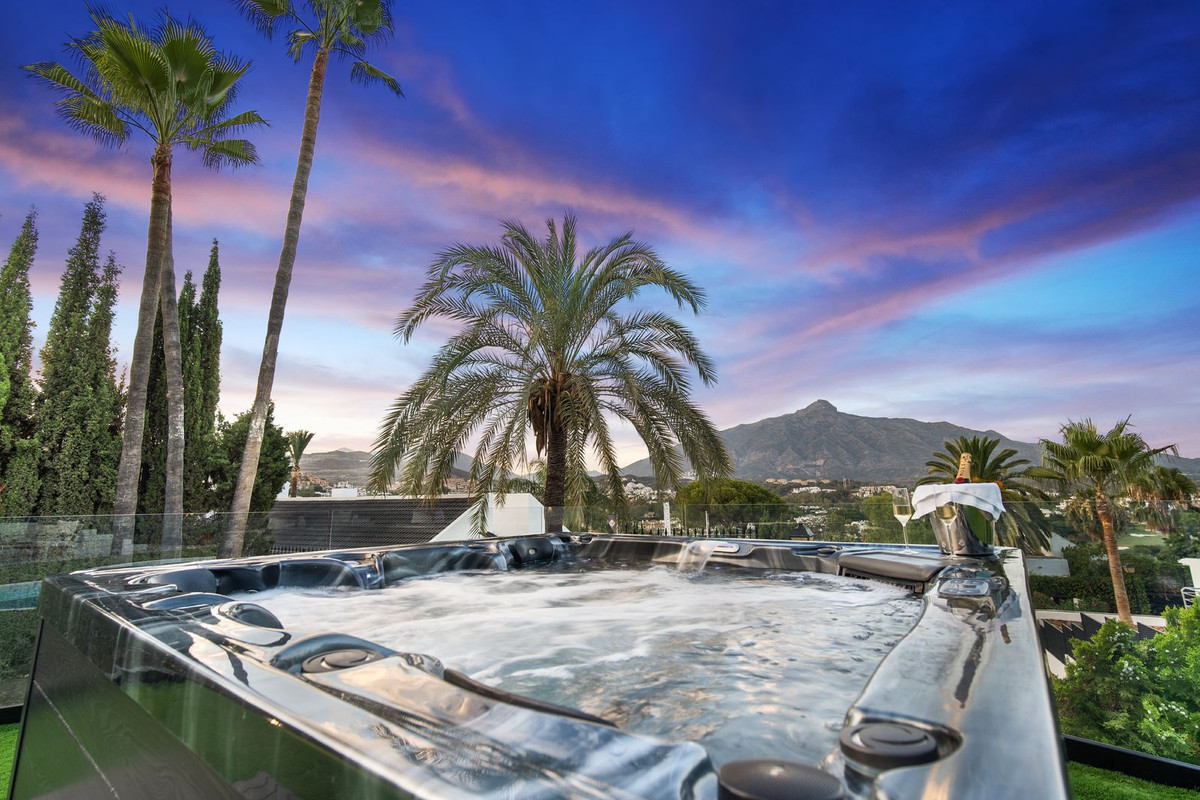 Spectacular new villa in Nueva Andalucia New on the market 2023 stunning villa offers the following layout : 5 bedrooms / en-suite 5 bathrooms, 2 extra bathrooms, living room with extended open plan kitchen. Access to a south facing covered terrace. Distributed on three levels, it comprises, on the main floor: spacious living room with several seating areas; open-plan fully fitted kitchen/dining area equipped with top appliances and with a central island and wine cooler; en-suite guest bedroom; access to the porches, terraces, swimming pool and the carefully landscaped garden with jacuzzi. Upstairs: two guest en-suite bedrooms with fabulous views over La Concha, stunning master suite with dressing room and a terrace also enjoying the amazing views. Lower level: cinema, further guest bedroom with en-suite bathroom; garage for 1 car. Possibility to add a gym on this level. Special features include underfloor heating in the bathrooms and home automation system throughout. Just minutes away from several international schools, world class golf courses, gastronomic experiences and amenities, this magnificent home is set within a quiet gated complex with 24-hour security, guaranteeing a total privacy. The main house has been recently refurbished to the latest standards including central heating and double glazed windows.