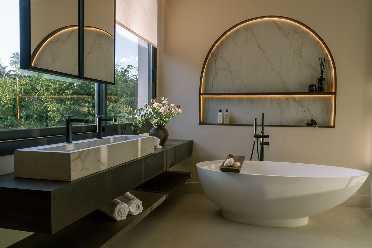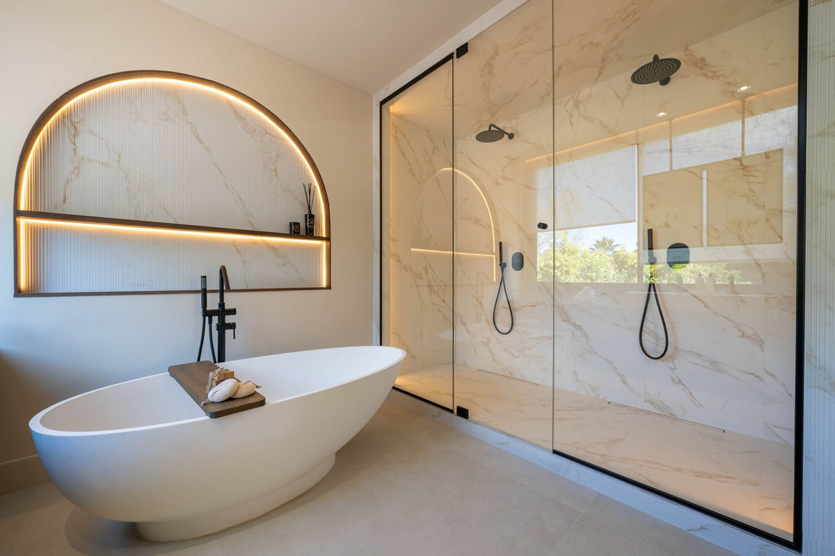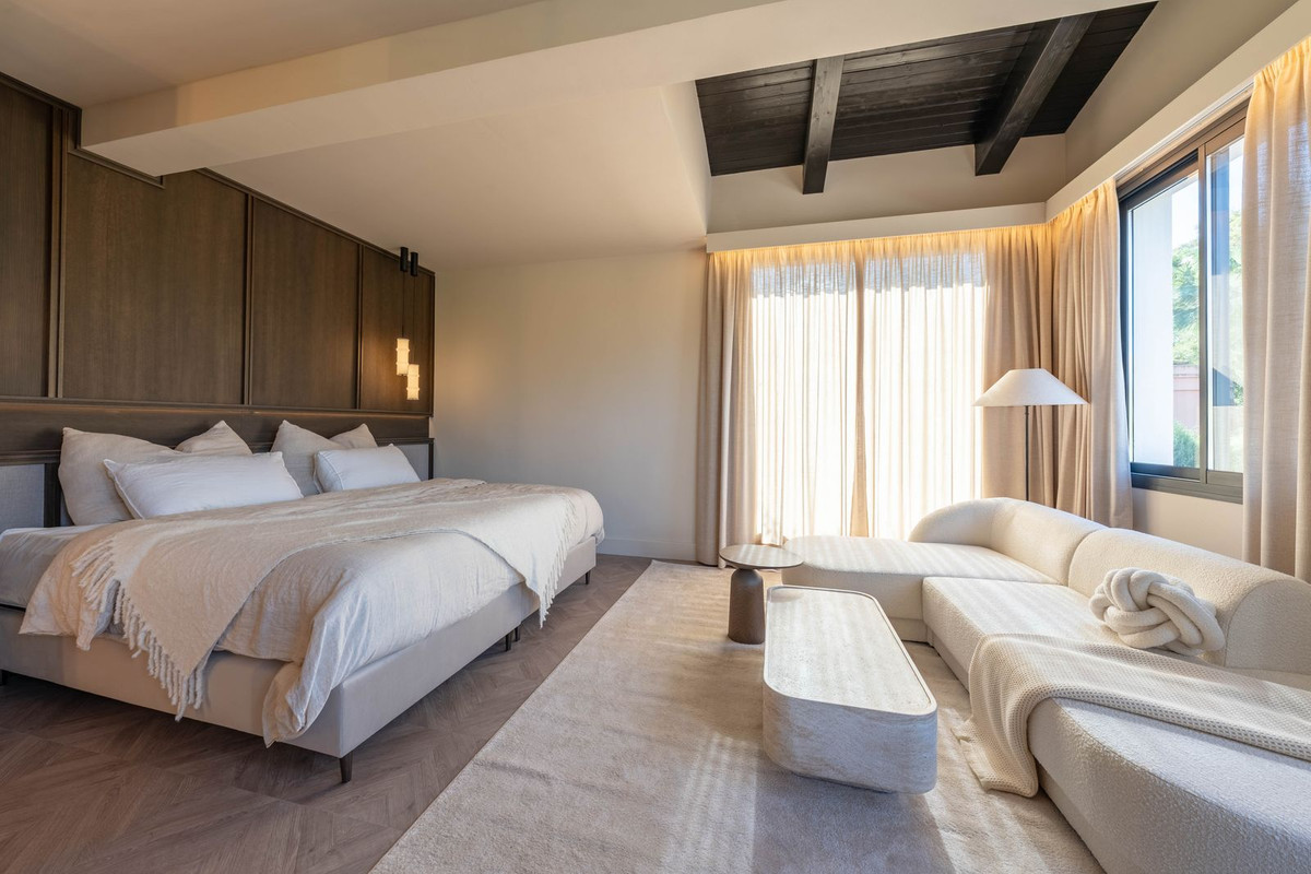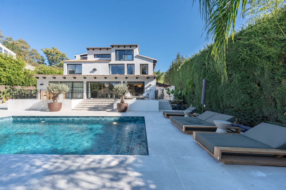 Welcome to this stunning villa in the heart of Nueva Andalucía, where privacy and modern convenience seamlessly blend together. Recently renovated in the serene Scandinavian-Japandi style, this exceptional home offers an elegant retreat that prioritizes comfort and tranquility. Inside, you’ll find a harmonious use of natural materials and calming colors, creating an inviting atmosphere that promotes relaxation. The spacious layout features five beautifully designed bedrooms and six modern bathrooms, making it an ideal space for families and those who love to entertain. The expansive garden provides an extraordinary sense of privacy, surrounded by lush greenery that evokes a serene, jungle-like ambiance, allowing you to unwind in your own personal oasis. The living room effortlessly connects to the outdoor space, ensuring a fluid transition between indoor and outdoor living. This inviting area is perfect for relaxation or entertaining, enhanced by an outdoor BBQ that is ideal for hosting gatherings. On warm days, take a refreshing dip in the massive pool, perfect for sunbathing and enjoying the outdoors. As the evenings cool down, unwind in the luxurious jacuzzi, a cozy retreat that invites relaxation under the stars. Equipped with smart home technology, this villa offers modern amenities that enhance convenience and security, allowing you to effortlessly control various aspects of your home. For fitness enthusiasts, there is also an outdoor gym, making it easy to maintain an active lifestyle while soaking in the breathtaking views. This villa is not just a home; it’s a luxurious sanctuary that combines cutting-edge technology, nature’s beauty, and the utmost privacy. Don’t miss the opportunity to make this exquisite property yours!