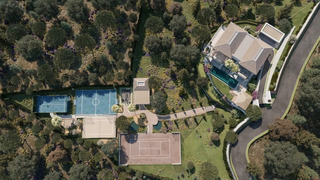 Gelegen in een van de meest exclusieve gated communities van La Quinta, is deze uitzonderlijke villa een meesterwerk van modern design, luxe en lifestyle. Gelegen op een ruim perceel van 13.356 m² met 1.341 m² prachtig ontworpen woonoppervlak, combineert de woning architectonische elegantie met voorzieningen in resortstijl - voor een werkelijk ongeëvenaarde woonervaring in Marbella. Vanaf het moment dat u aankomt via de eigen oprit en carport, maakt de woning een gedurfde indruk met zijn opvallende gevel en naadloze integratie in het omringende landschap. Binnen verenigt een ruime open indeling de binnen- en buitenruimtes, wat zorgt voor een ononderbroken doorstroming en panoramisch uitzicht vanuit elke hoek. Het hoofdterras is een droom voor elke entertainer, met een stijlvol privézwembad, een volledig uitgeruste buitenkeuken en diverse lounge- en eetruimtes in de openlucht. Het aangelegde terrein biedt een complete reeks recreatiefaciliteiten, waaronder een tennisbaan, paddle-tennisbaan, beachvolleybalveld, voetbalveld, buitenfitnessruimte en een chique tuinbar op de benedenverdieping – ideaal voor het ultieme buitenleven. Binnen is geen enkel detail over het hoofd gezien. De villa beschikt over een ultramoderne keuken en een aparte servicekeuken, geschikt voor zowel informele als formele diners. Voor momenten van ontspanning en verwennerij kunt u genieten van de luxe binnenspa, compleet met verwarmd zwembad, jacuzzi, koud dompelbad en sauna. Andere hoogtepunten zijn een thuisbioscoop, pokerruimte, wijnkelder en meer – ontworpen om in stijl te entertainen. Met acht elegant ingerichte slaapkamers en zeven complete badkamers plus drie gastentoiletten biedt de woning voldoende ruimte voor familie en gasten. De master suite is een echte blikvanger met een inloopkast en een luxe en-suite badkamer met designafwerking. De villa is perfect op het zuiden georiënteerd, biedt het hele jaar door zon en gemakkelijke toegang tot de topattracties, golfbanen en stranden van Marbella. Deze residentie is een unieke ervaring die luxe voorzieningen, privacy en tijdloos design combineert tot een buitengewoon lifestyle-landgoed.