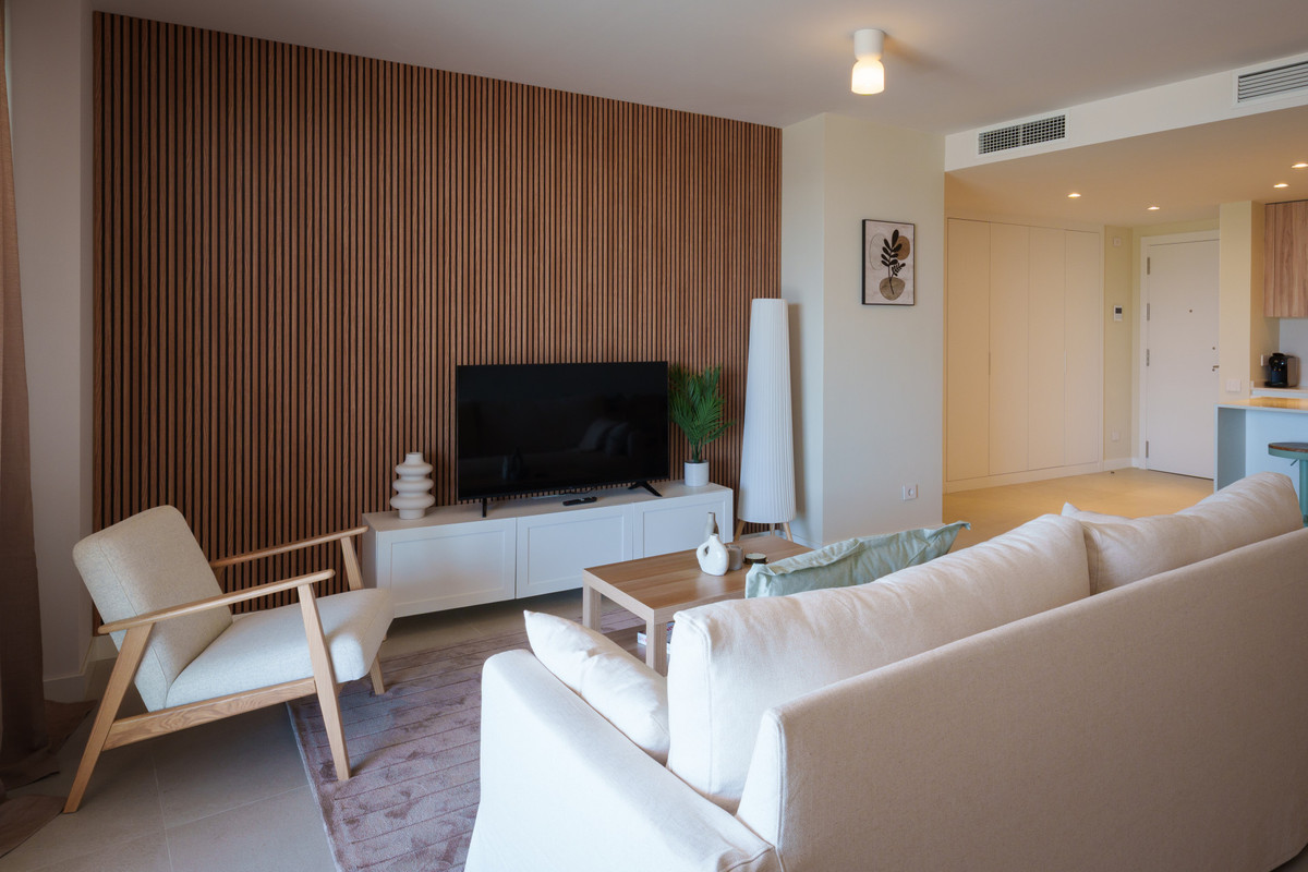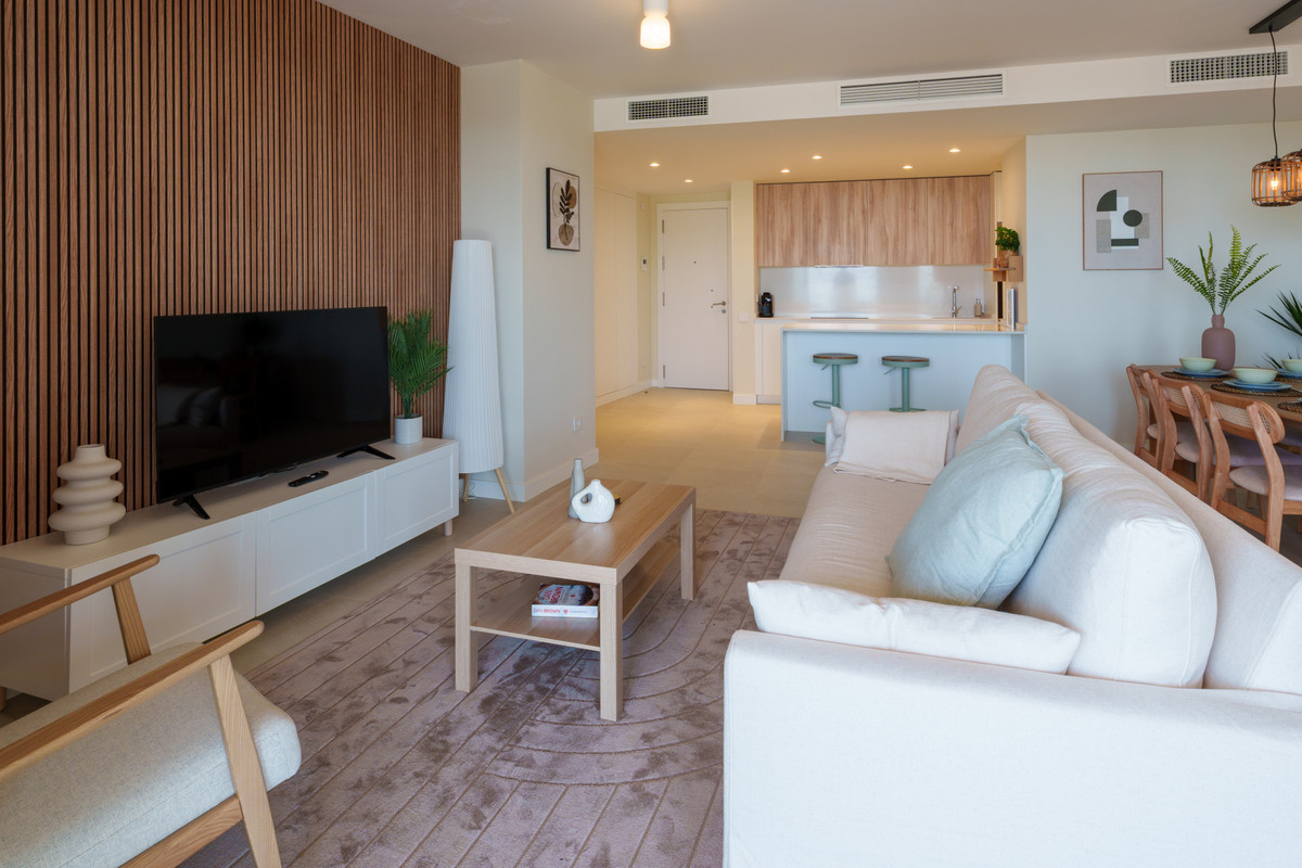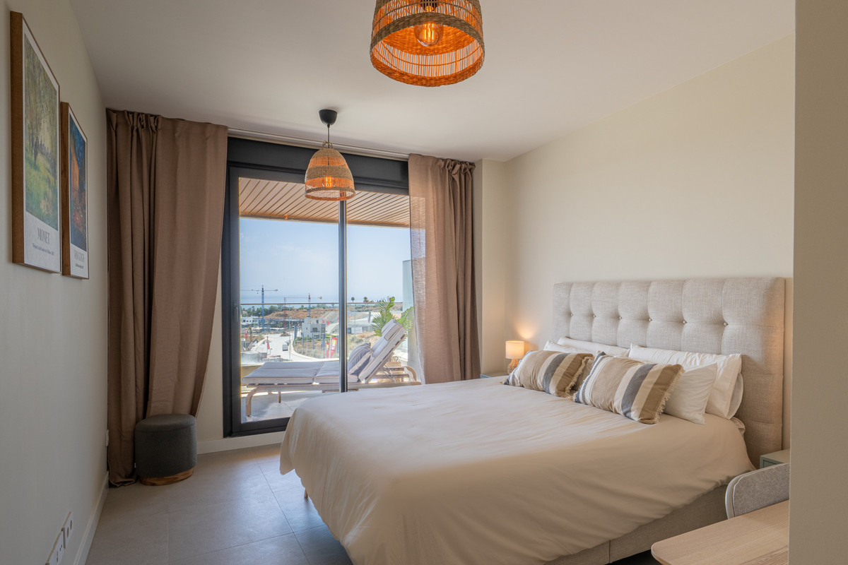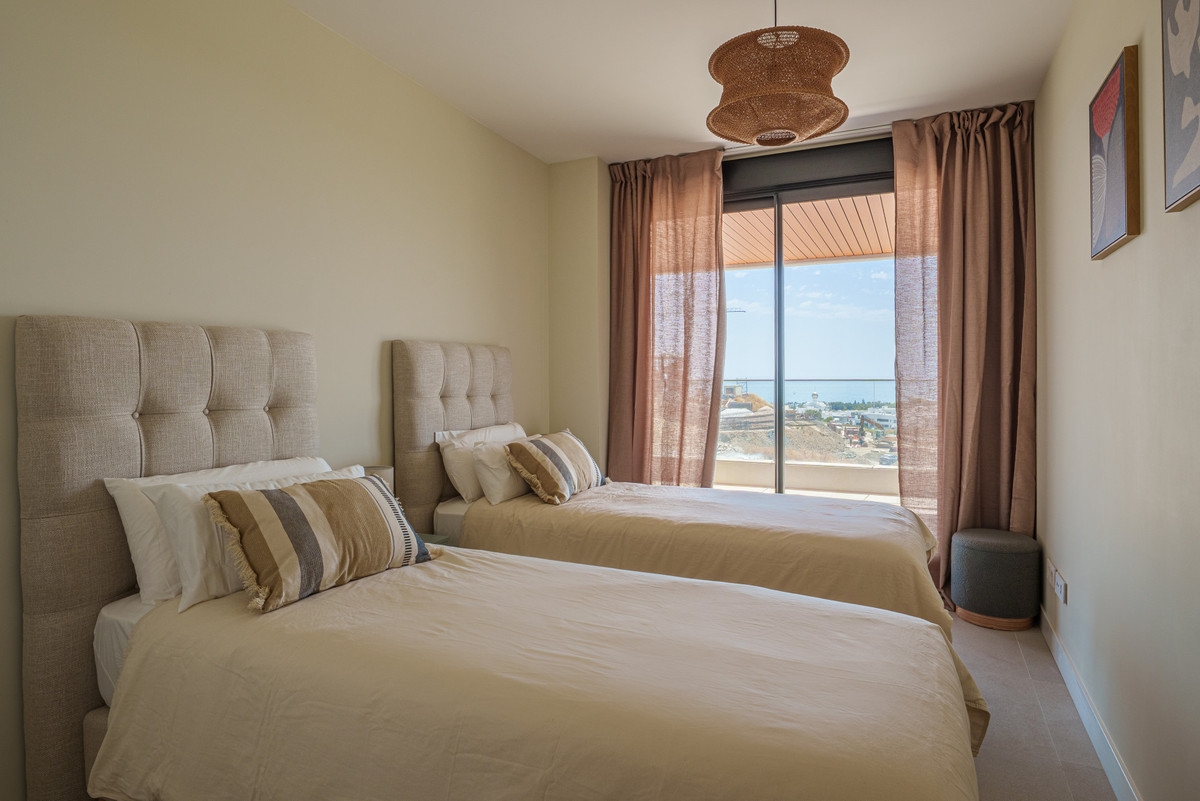 Beautiful 2-bedroom, 2-bathroom apartment in the exclusive brand new urbanization of Vanian Views in Estepona. The apartment features two generously sized bedrooms, both filled with natural light and decorated in soothing neutral tones which provides direct access to a private terrace, offering the perfect spot to enjoy your morning coffee or unwind in the evening. The two bathrooms are beautifully designed with contemporary fixtures with underfloor heating The open-plan living room, creates an inviting and serene space for relaxation. It opens seamlessly onto a large private terrace equipped with comfortable outdoor seating, ideal for al fresco dining or simply soaking in the panoramic sea views. The modern kitchen, open to the living area, is fully equipped with high-quality appliances and ample storage, making it a functional yet stylish space for cooking and entertaining. Vanian Views is a modern and exclusive residential development, combining semi-oval architectural design, breathtaking sea views, and an exceptional location next to Selwo Natural Park. It is an ideal choice for those seeking a contemporary home in a natural, well-connected setting—whether as a primary residence, a second home, or a high-potential rental investment. De community offers an outdoor swimming pool, a co-working area, gym and spa
