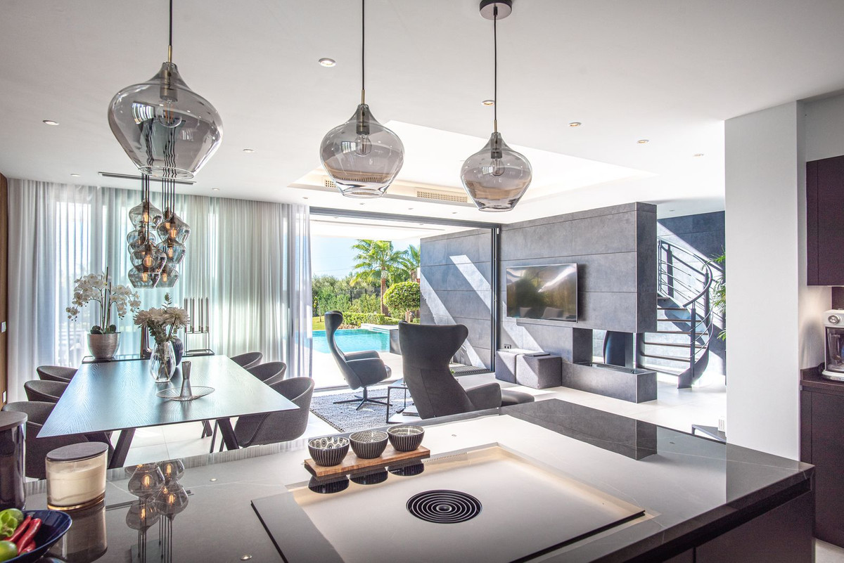 Located on a private and tranquil street, front line to the Valle Romano golf course in Estepona, Villa 17 is a stunning modern masterpiece that radiates beauty and serenity. With panoramic sea, golf, and mountain views, and just minutes away from the vibrant town of Estepona, this home offers the perfect balance of luxury and convenience. Within this prestigious location, you are only a short distance from the beach, enjoying the fantastic outdoor lifestyle and entertainment that Estepona has to offer. This 6-bedroom, 5-bathroom villa sits on a generous plot of over 1,000 m² with a built area of 383 m², plus an additional 150 m² of terraces. Enter through impressive iron doors into a spacious and bright living room, beautifully designed with bespoke interiors and floor-to-ceiling windows that flood the home with natural light. The villa features a generous terrace with a sunken lounge and fire pit, complemented by a private pool and an outdoor kitchen equipped with a gas BBQ, hot/cold tap, and dining area. From here, you can enjoy breathtaking views of the Mediterranean Sea and the golf course. Upstairs, a sophisticated master suite opens onto its own terrace with gorgeous views. The impressive basement level is designed for entertainment, offering a TV area, wine bodega, and a cinema room. The property has been carefully designed with energy efficiency in mind. It features a state-of-the-art domotic system that controls interior and exterior lighting, air conditioning, a heat pump for the swimming pool, intercom, and alarm system. A 16-panel photovoltaic solar energy system powers the villa, with smart monitoring via an app to track consumption and store excess energy in a private power bank. Every detail has been thoughtfully considered, giving this villa the perfect blend of style and sophistication - ready to impress even the most discerning buyer. Plot size: 1,005 m² Built area: 383 m² Terraces: 150 m²