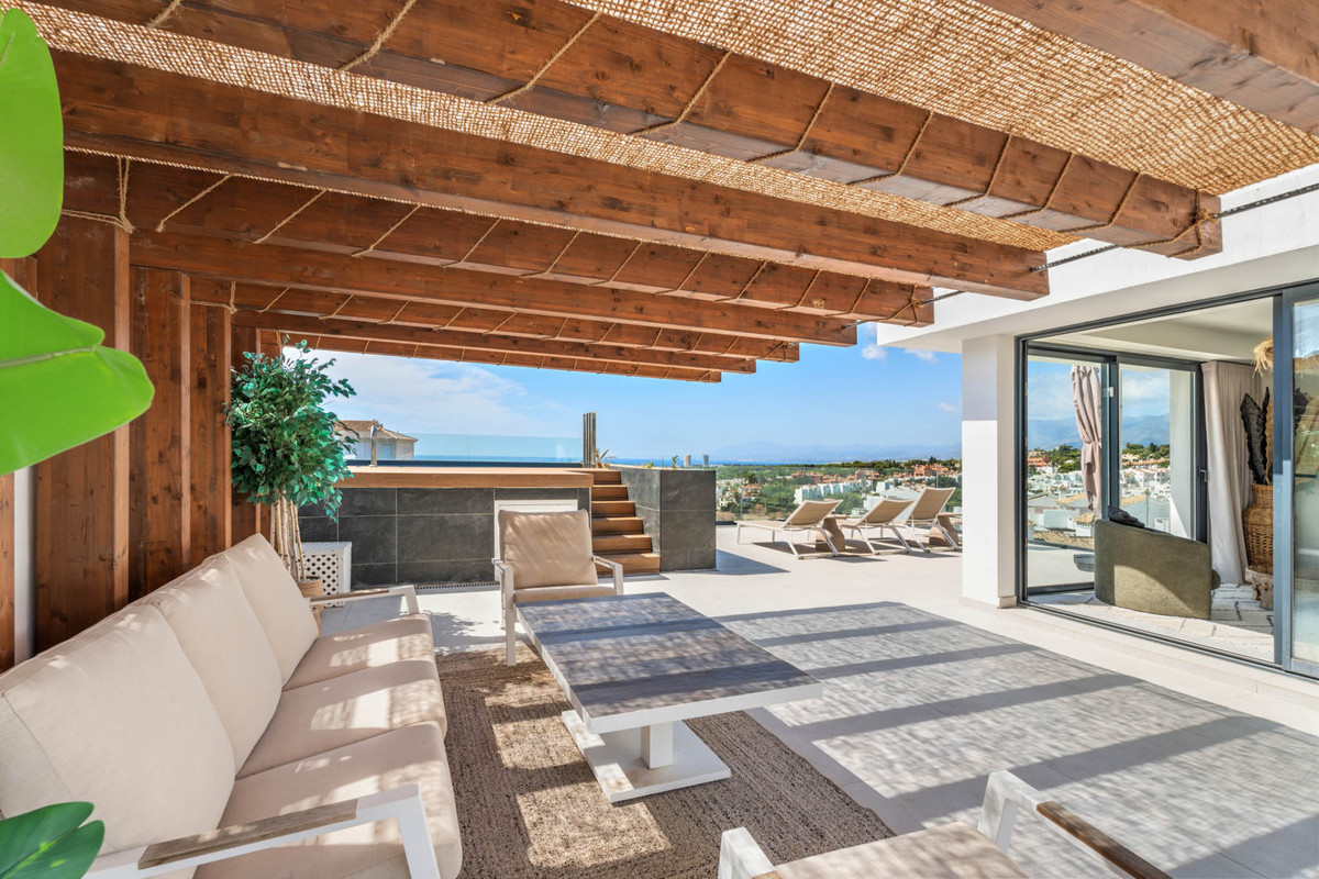 This contemporary duplex penthouse in Marbella East is thoughtfully designed across two levels, combining modern architecture with well-defined living spaces. Every detail has been considered to maximize natural light, seamless indoor-outdoor living, and privacy. The main floor opens to a spacious living and dining area with direct access to a large terrace that frames the home with Mediterranean views. Floor-to-ceiling windows create a fluid transition between the interior and exterior. The modern kitchen, with a functional and balanced layout, serves as the central hub of the residence. On this level, three bedrooms are arranged for comfort and privacy. The primary suite and one guest bedroom, both with en-suite bathrooms, are located in a private night area. The primary suite also features a dressing area and direct terrace access. A third guest bedroom with fitted wardrobes is complemented by a separate full bathroom. The upper floor introduces an additional living space that opens onto the solarium — an elevated retreat featuring a private pool and expansive terraces with panoramic views of the Mediterranean Sea. This space is ideal for outdoor relaxation, dining, and entertaining. The orientation of the property ensures a harmonious balance of light and shade throughout the day, while the terraces provide multiple outdoor living areas that enhance the contemporary design. Property highlights: - Two-level penthouse villa with contemporary architecture - Living and dining area of nearly 50 m² with direct terrace access - Kitchen of 17 m² at the heart of the home - Primary suite of 21 m² with en-suite bathroom, dressing area, and terrace access - One guest bedroom with en-suite bathroom - Additional guest bedroom with fitted wardrobe and separate bathroom - Solarium of 123 m² with private pool and sea views - Landscaped gardens and outdoor terraces This villa in Marbella East offers a refined balance between architectural design, functional interiors, and outdoor living. With its elevated solarium, sea views, and private pool, it represents a distinguished residence within close proximity to the Mediterranean coastline, golf courses, and exclusive amenities.