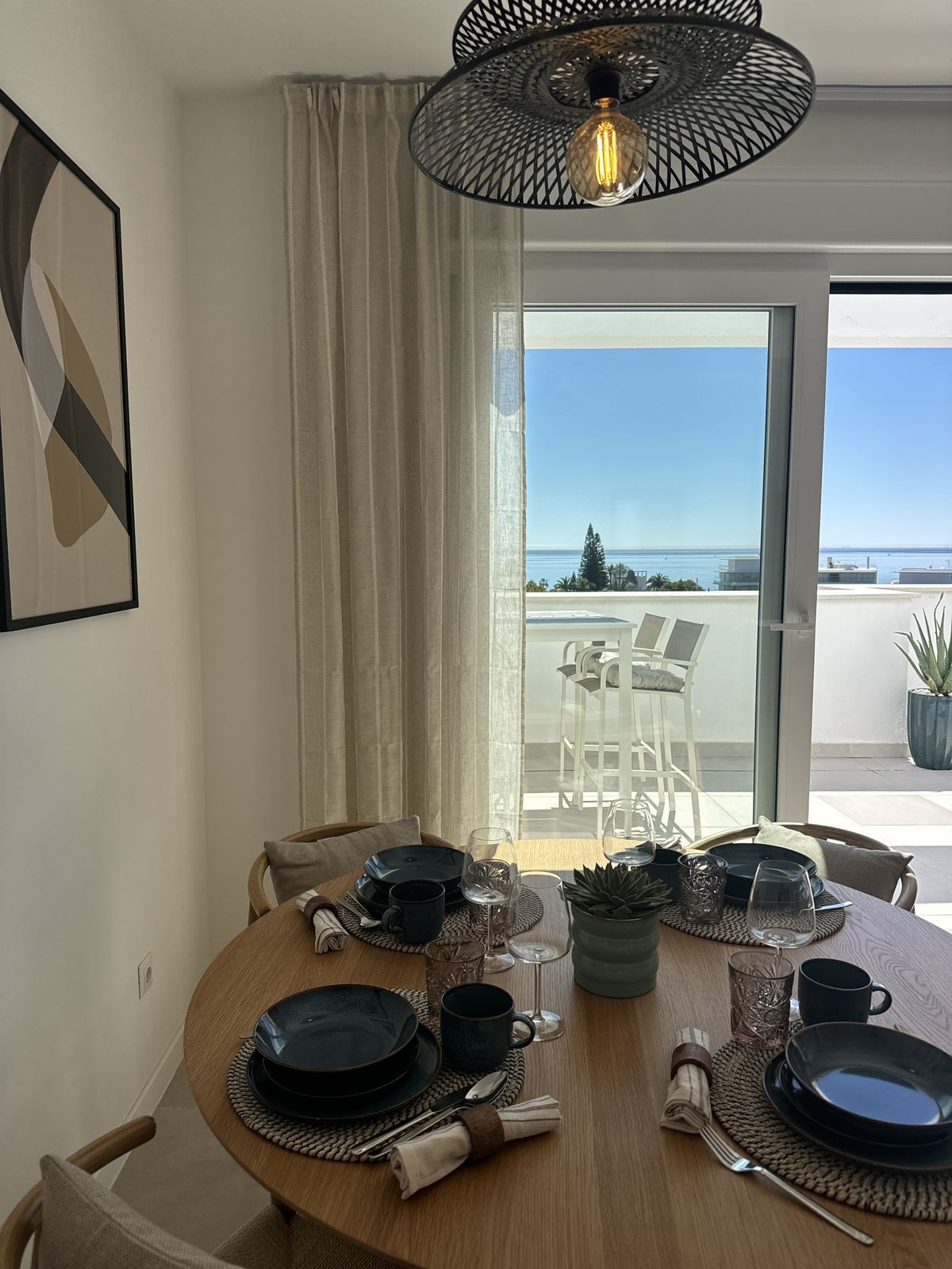 This TOP FLOOR penthouse is located in a newly build development Celere Sea View in Estepona (Malaga), located in a newly developing built-up area, only 5 minutes from the town centre and the Estepona Marina. This location offers many leisure and service opportunities. Right next to the development you will find your daily supermarkets, as well as restaurants, school, sport center, the Estepona High Resolution Hospital all surrounded by several golf courses within a 5km radius, including Doña Julia Golf, Finca Cortesín Golf Club, Estepona Golf and Valle Romano Golf. This area is developing rapidly and has the potential to increase prices. This development is newly built, completed in November 2024. It consists of 3 intimate blocks of flats, ideally located; there are two supermarkets, a pharmacy and two restaurants right next to it and the beach is 300 meters away. The complex has a swimming pool, relaxation area and gym. The apartment is located on the top floor and has fantastic panoramic sea views from the terrace. The price includes a parking place in the underground garage and a storage room. This property meets all the conditions for short or long-term rental and is an ideal opportunity to invest funds.