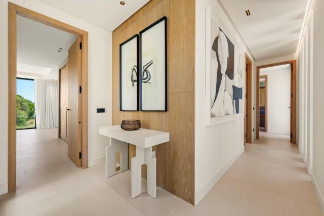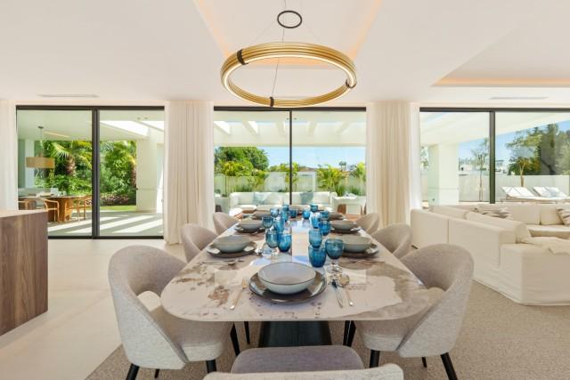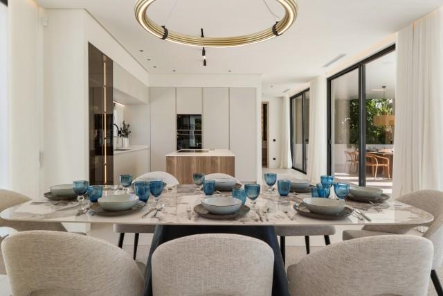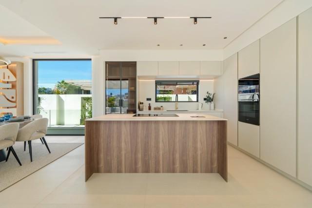 Ervaar het hedendaagse leven aan de kust op zijn best in deze uitzonderlijke luxe villa met 5 slaapkamers te koop in San Pedro de Alcántara, een van Marbella's meest gewilde wijken aan het strand. Deze woning combineert strakke, moderne architectuur met verfijnde interieurs en voorzieningen in resortstijl en biedt verfijning, comfort en de ontspannen elegantie van de mediterrane levensstijl. Gelegen op een perceel van 612 m² met 446 m² bebouwde oppervlakte, is de villa omgeven door weelderig groen en omsloten door strak witte muren voor privacy. De zuidgerichte ligging baadt elke hoek in natuurlijk licht, terwijl het ontwerp het binnen- en buitenleven maximaliseert. Buiten nodigt een sprankelend privézwembad met een stijlvol houten terras en een ruim overdekt terras uit tot moeiteloos entertainment. Het dakterras biedt een verhoogde plek om te zonnebaden, cocktails te drinken bij zonsondergang of te ontspannen onder de sterrenhemel. Binnen is de sfeer licht en luchtig, met kamerhoge ramen, neutrale tinten en elegante inbouwverlichting die het gevoel van ruimte versterken. De open woon- en eetkamer is voorzien van een op maat gemaakte tv-wand en loopt naadloos over in de ultramoderne keuken, compleet met een warm houten kookeiland, hoogwaardige inbouwapparatuur en strakke kasten – de perfecte mix van design en functionaliteit. Elk van de vijf slaapkamers is een oase van rust, met grote terrassen en en-suite badkamers in spa-stijl met zwevende wastafels, vrijstaande baden en marmeren afwerkingen. De hoofdslaapkamer maakt indruk met zijn ruime indeling en directe toegang tot een privé zonneterras, met een sereen uitzicht en volledige privacy. Op de benedenverdieping creëren een volledig uitgeruste fitnessruimte, sauna en stoombad een privé wellnessresort, terwijl een beveiligde garage voor twee auto's en een verfijnde entree de ervaring compleet maken. Gelegen op slechts een steenworp afstand van het strand en op korte rijafstand van Puerto Banús en Marbella, is deze villa de belichaming van moderne mediterrane luxe – ideaal als gezinswoning, vakantiehuis of luxe investering aan de Costa del Sol.