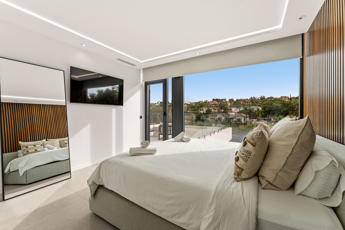 Contemporary masterpiece that perfectly balances architectural sophistication with practical design, located in El Paraiso. Completed in 2023, this modern villa showcases the vision of a renowned architect who excels in blending elegance with functionality. Surrounded by the tranquility of a golf course backdrop, the property offers a lifestyle that combines comfort, privacy, and refined Mediterranean living. The home features five spacious bedrooms, four of them en suite, along with three additional bathrooms and a guest toilet. Interiors highlight a minimalist yet warm aesthetic, enhanced by high-quality finishes and carefully selected furnishings. At the heart of the villa is an open-plan kitchen and living area. The kitchen, equipped with premium Miele appliances, reflects innovation and quality, while the living space extends seamlessly to a terrace with views of the lush fairways. This integration of indoor and outdoor spaces makes the villa ideal for relaxed family living as well as larger gatherings. On the first floor, the master bedroom offers a private retreat with an en suite bathroom and access to a terrace overlooking the golf course, creating a perfect spot for morning coffee or evening relaxation. Another en suite bedroom is also located on this level, with direct access to the terrace and its serene views. The basement expands the lifestyle offering of the property with a dedicated cinema room, a guest suite, and two additional bedrooms sharing a bathroom, ensuring plenty of space for family and visitors alike. Outdoor living is equally impressive. A saltwater swimming pool, pre-installed for heating, merges visually with the golf course, creating a seamless horizon of green and blue. A fully fitted outdoor kitchen and BBQ area make entertaining effortless, while the expansive terrace provides the perfect stage for al fresco dining. The villa’s south-facing orientation ensures light-filled interiors and sunny terraces throughout the year. Modern technology enhances the practicality of the home. Electric blinds, double-glazed windows, an advanced alarm system, and a smart home setup provide both comfort and security. An automatic irrigation system maintains the landscaped gardens, allowing residents to focus on enjoying their surroundings. The Villa’s location is as appealing as its design. Within five minutes’ drive are local shops, and in just 10 minutes residents can reach excellent international schools and some of Estepona’s finest beaches. The nearby neighborhood of El Ingenio adds further charm, with a mix of Andalusian-style villas and modern apartments surrounded by greenery. The area offers a peaceful atmosphere yet remains close to the vibrant amenities of Marbella and Puerto Banús. Lifestyle opportunities abound. Golfers will appreciate the proximity to prestigious courses such as Aloha Golf Club and Las Brisas in Nueva Andalucía’s famed Golf Valley. Fitness enthusiasts can enjoy nearby wellness facilities, including Real Club Pádel Marbella. Dining options are plentiful, ranging from the stylish Magna Café and Mosh Kitchen to local tapas bars and cafés. Shopping is equally convenient, with Centro Plaza and the bustling Saturday market at Plaza de Toros just a short drive away. Families benefit from proximity to highly regarded schools such as Aloha College and Laude San Pedro International College, while excellent transport links via the A-7 motorway and local bus services ensure easy connectivity to Marbella, Estepona, and Málaga Airport. This is more than a property—it is an opportunity to embrace a sophisticated lifestyle in one of the Costa del Sol’s most desirable settings. Whether as a permanent residence or a luxurious holiday retreat, this villa combines striking architecture, high-end amenities, and a prime location to create a home where every day feels exceptional.