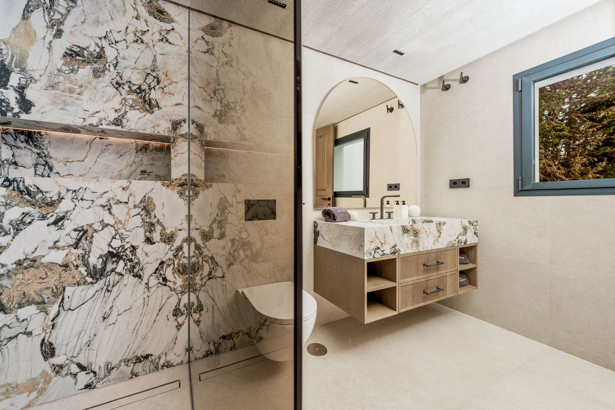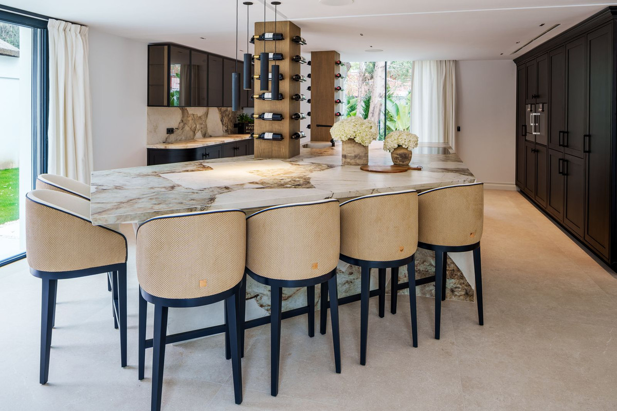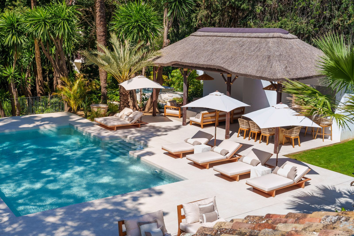 Villa “Las Palmeras”. One of Marbella`s finest villas on the market, in the prestigious Las Brisas of Nueva Andalucia. This impressive 1256m2 villa sits on a gigantic 2560m2 plot, completely private and featuring an incredibly beautiful lush garden. Built over 3 floors, it has a huge basement, over 300m2 with 3m ceiling height, offering ample space for entertainment and leisure features. These include a huge garage, a driveway with a car turning plate, a spa with sauna and steam room, an state of the art indoor gym as well a home cinema – all with direct access to the garden. The villa further has traditional features like a patio, an outdoor master shower with views over the golf and a separate TV room. Floor plans are available.
