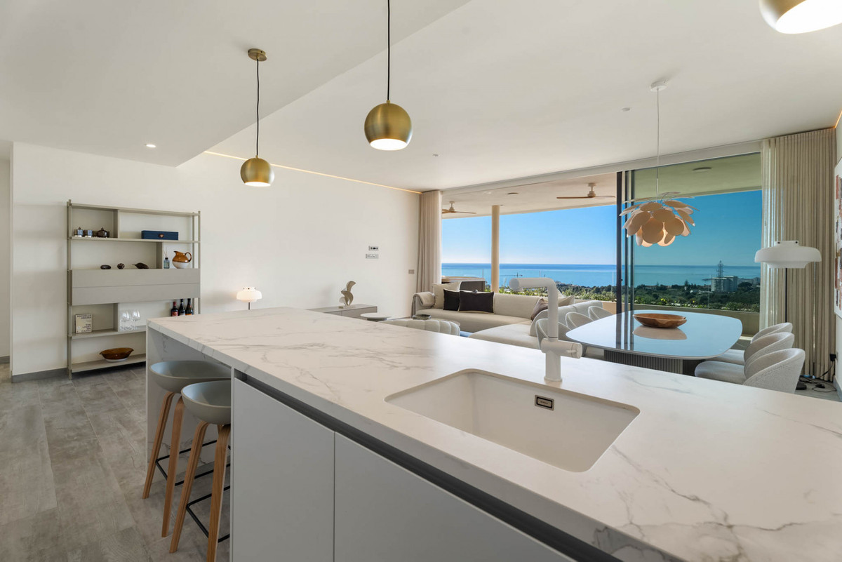Situaded within a secure residential enclave in El Higuerón, this brand-new three-bedroom corner apartment offers refined contemporary living with open sea and valley views. Located in the most elevated and private phase of the development, the property benefits from protected outlooks due to the agricultural land set in front, preserving long-term views and privacy. With a total built interior of 117,11 m² and a spacious corner terrace, the residence is designed to create a seamless connection between indoor and outdoor living. The southwest orientation ensures natural light throughout the day and evening sunsets over the Mediterranean. The interior layout is carefully arranged. The living and dining area extends across 36.56 m², directly connected to the terrace, creating an ideal setting for entertaining or quiet retreat. The Italian Zampieri kitchen is fitted with AEG appliances and finished with clean architectural lines and functional storage. Saloni ceramic flooring runs throughout the home, reinforcing a cohesive aesthetic. The primary suite measures 17.48 m² and includes fitted Santalucia Mobili wardrobes and an en-suite bathroom with underfloor heating. Two additional bedrooms (12.13 m² and 12.88 m²) share a second bathroom, also with underfloor heating. A separate laundry room adds practicality to the layout. Built in 2025 to European CTE building standards, the apartment incorporates aerothermal climate control for efficient heating and cooling, technical exterior carpentry for enhanced thermal and acoustic insulation, and an upgraded domotics system. Blinds, lighting, and climate settings are managed via wall panels or mobile application. Integrated smart features include flood detection with automatic water shut-off, smoke detection, and power-cut alerts. The property is sold fully furnished by BoConcept and includes two underground parking spaces and a storage room. Residents enjoy landscaped gardens, an infinity pool with sun loungers, and 24-hour gated security. The apartment is within walking distance of Higuerón Resort, spa, and sports facilities, five minutes from the beach, 15 minutes from Málaga Airport, and 20 minutes from Málaga city. Property Highlights - 3 bedrooms | 2 bathrooms | 1 en-suite - 117,11 m² built interior - 81,57m² southwest-facing terrace - Sea and green valley views - Italian Zampieri kitchen with AEG appliances - Underfloor heating in bathrooms - Aerothermal climate control system - Advanced home automation system - Fully furnished by BoConcept - 2 underground parking spaces - Private storage room - 24-hour gated community with infinity pool