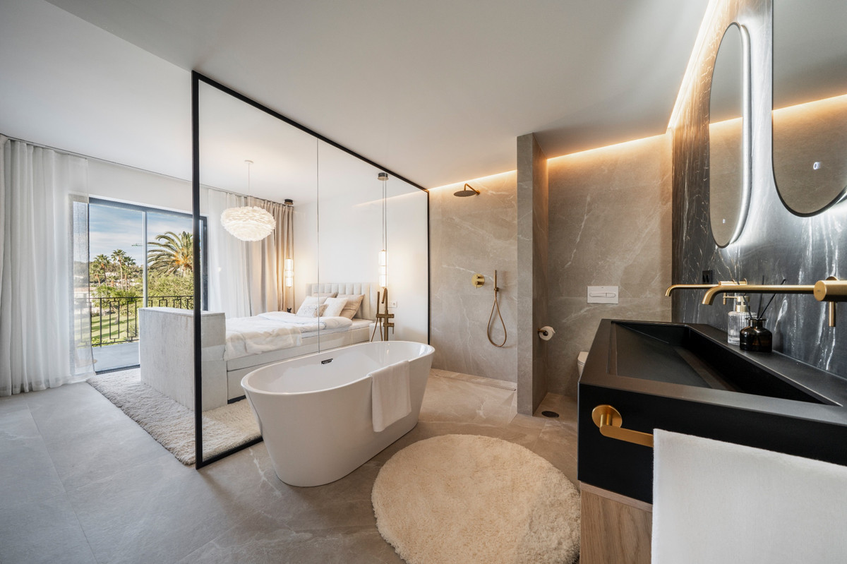 Setting: Close To Golf, Close To Port, Close To Shops, Close To Sea, Close To Town, Close To Schools Orientation: South West Condition: New Construction Pool: Communal Climate Control: Air Conditioning, Central Heating, U/F/H Bathrooms Views: Sea, Mountain, Golf, Garden, Pool Features: Covered Terrace, Fitted Wardrobes, Near Transport, Private Terrace, WiFi, Ensuite Bathroom, Barbeque, Double Glazing, Fiber Optic Furniture: Fully Furnished Garden: Private Security: Electric Blinds, Alarm System Parking: Communal Category: Luxury