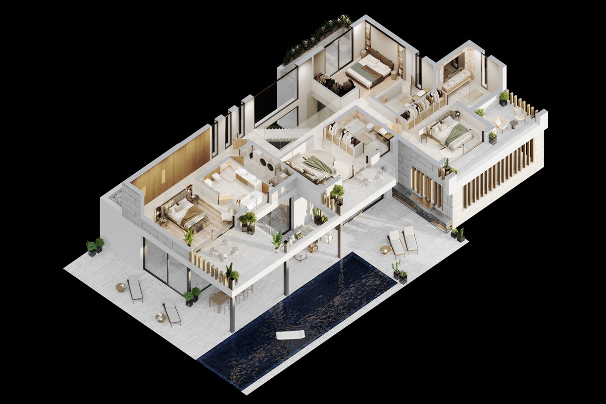 Designed for those who value space, privacy, and understated elegance, this exceptional villa sits on a private plot of 1,041.19 m² in one of the most desirable enclaves of the New Golden Mile. With a total built area of 603.27 m², including 358.52 m² of interior living space, the property offers a harmonious balance between architecture and lifestyle, where every space has been created to feel open, natural, and connected. The villa features 4 bedrooms and 4.5 bathrooms, each designed with comfort and privacy in mind. The upper floor hosts the main sleeping quarters, where en-suite bedrooms open onto private terraces, offering peaceful views and a sense of calm that defines the entire home. The main living area is where the villa truly comes to life. A spacious open-plan layout brings together the living room, dining area, and kitchen, creating a central space that is both elegant and functional. Expansive floor-to-ceiling windows flood the interiors with natural light and provide direct access to the outdoor areas, blurring the boundaries between inside and out. Outdoor living is at the heart of this property. With 130.22 m² of open terraces and 61.92 m² of covered terraces, the villa offers multiple environments to enjoy throughout the day, from shaded lounging areas to sunlit relaxation spaces. The private pool of 47.25 m² sits at the centre of the garden, creating a perfect setting for both quiet moments and social gatherings. The kitchen has been designed as a central feature of the home, combining refined aesthetics with practicality. Clean lines, premium appliances, and high-quality materials create a space that is both visually striking and highly functional. Throughout the property, attention to detail is evident in every finish. Large-format flooring enhances the sense of continuity, while carefully selected materials and refined carpentry contribute to a timeless, modern aesthetic. The villa also includes a 52.61 m² private garage, along with advanced technical features such as underfloor heating, efficient climate control, and smart home systems, ensuring comfort and convenience in every season. Set in a privileged location close to golf courses, beach clubs, and essential services, this villa offers a lifestyle defined by quality, tranquillity, and connection to the Mediterranean environment. A property where design, space, and location come together effortlessly.