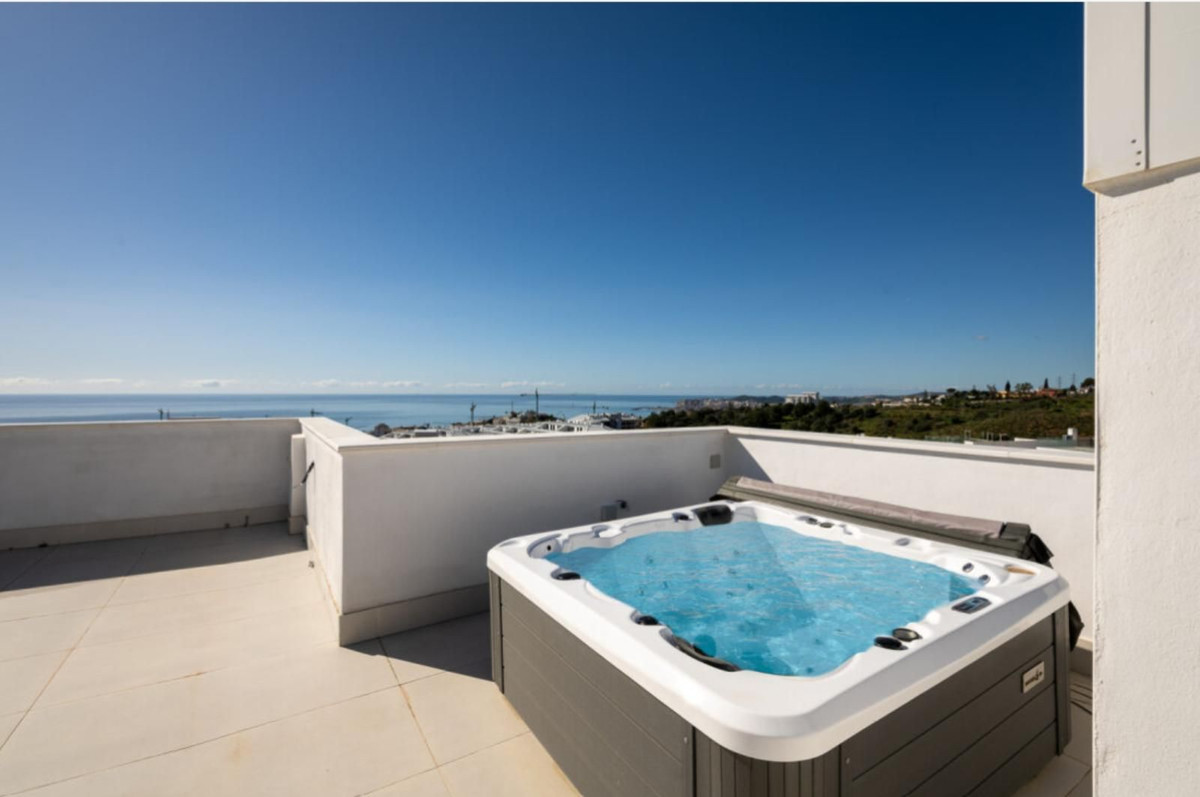 Discover elevated Mediterranean living in this striking penthouse in Reserva del Higuerón, ideally situated just a short 400-meter walk from the beaches of Fuengirola. This beautifully designed two-bedroom residence combines contemporary style with effortless comfort, offering panoramic sea views and an exceptional sense of space. The private rooftop solarium, complete with a jacuzzi, provides the perfect setting for relaxing, entertaining, or simply enjoying the views from sunrise to sunset. Inside, the apartment features a bright open-plan layout, where the living and kitchen areas are seamlessly integrated and enhanced by large floor-to-ceiling windows that fill the home with natural light. Two private parking spaces and a storage room are also included for added convenience. The property forms part of a secure gated community with 24-hour surveillance, ensuring a calm and private living environment. Landscaped gardens and green areas create a peaceful, resort-style atmosphere throughout the development. Residents have access to a wide range of high-quality amenities, including a fully equipped gym, spa facilities, stylish communal lounges, and coworking spaces. Outdoor areas include swimming pools, sun terraces, and beautifully maintained gardens, all designed to make the most of the Costa del Sol’s exceptional climate, along with walking and cycling paths for an active lifestyle. Perfectly located, the penthouse is close to some of the best beaches on the Costa del Sol and within easy reach of restaurants, shops, schools, and essential services. With direct access to the AP-7 motorway, Málaga Airport is just a 15-minute drive away, while Málaga city and Marbella can both be reached in around 25 minutes. Set in the lively and desirable area of Fuengirola, this property offers an excellent combination of modern design, prime location, and relaxed coastal living—ideal as a permanent home, a holiday retreat, or a smart investment opportunity.