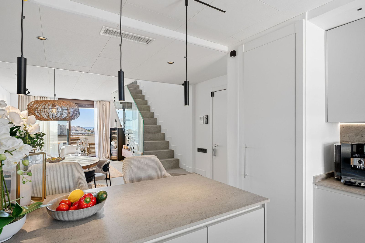 Dit uitzonderlijke penthouse is gelegen in het moderne wooncomplex South Place in Estepona en biedt de perfecte combinatie van comfort, stijl en een mediterrane levensstijl. Het complex omvat 51 exclusieve appartementen en penthouses, compleet met een zwembad, fitnessruimte, sociale club en directe toegang tot rustige stranden, terwijl alle essentiële voorzieningen op slechts een steenworp afstand liggen. Dankzij de gunstige ligging ten opzichte van de snelweg A7 bent u bovendien gemakkelijk in de buurt van bezienswaardigheden en omliggende kustplaatsen. Dit prachtige penthouse is volledig ingericht in elegante Scandinavische stijl en is met zorg gerenoveerd volgens de hoogste normen. Verbeteringen omvatten geluidsisolerende plafonds en geavanceerde smart-home systemen die op afstand via uw telefoon te bedienen zijn. Rolluiken, verwarming en verlichting kunnen allemaal vanaf elke plek ter wereld worden aangepast, zodat uw woning altijd klaar is voor uw aankomst. Elk meubelstuk is zorgvuldig geselecteerd en omvat hoogwaardige Zweedse bedden, verfijnde afwerkingen en een smaakvol ontwerp. Het hoogtepunt van de woning is het spectaculaire dakterras, compleet met een privéjacuzzi en eindeloze mogelijkheden tot personalisatie. Er is ook de mogelijkheid om een pergola, een buitenkeuken en extra entertainment- of ontspanningsruimtes toe te voegen, waardoor u uw eigen privé-oase in de zon kunt creëren. Een zeldzame kans om eigenaar te worden van een stijlvol, direct te betrekken penthouse in een van de meest gewilde nieuwbouwprojecten van Estepona.
